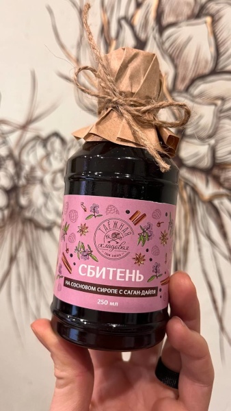 В составе нашего уникального сбитня ароматный цветочный мёд, 6 пряных специй (крица, гвоздика, бадьян, имбирь, черный перец, кардамон) и бодрящий саган-дайля!